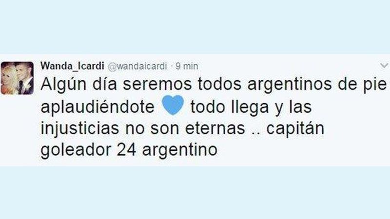 "Algún día seremos todos argentinos de pie aplaudiéndote. Todo llega y las injusticias no son eternas… capitán goleador 24 argentino", escribió la modelo en su cuenta de la red social. Minutos más tarde, se arrepintió y lo borró, aunque la captura de la publicación se mantuvo.