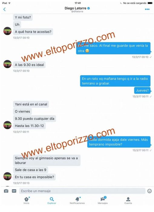 Las capturas de pantalla de los mensajes las filtró el portal El Topo Rizzo y se viralizaron rápidamente. En la conversación se observan arreglos para encontrarse y comentarios bien subidos de tono. Además se ve una foto de la mediática en una pose erótica.