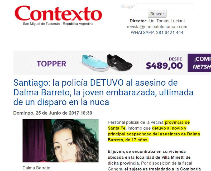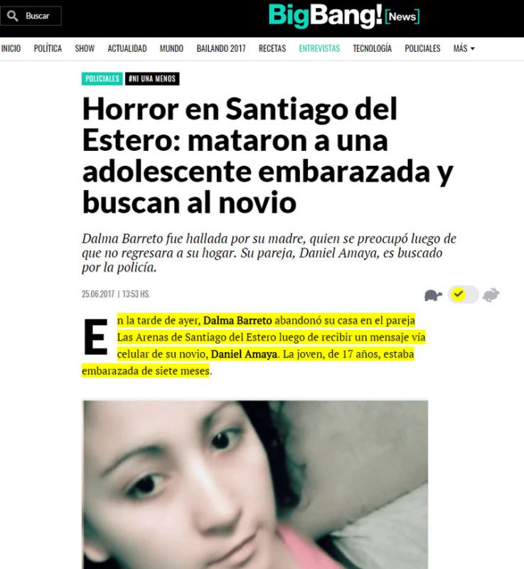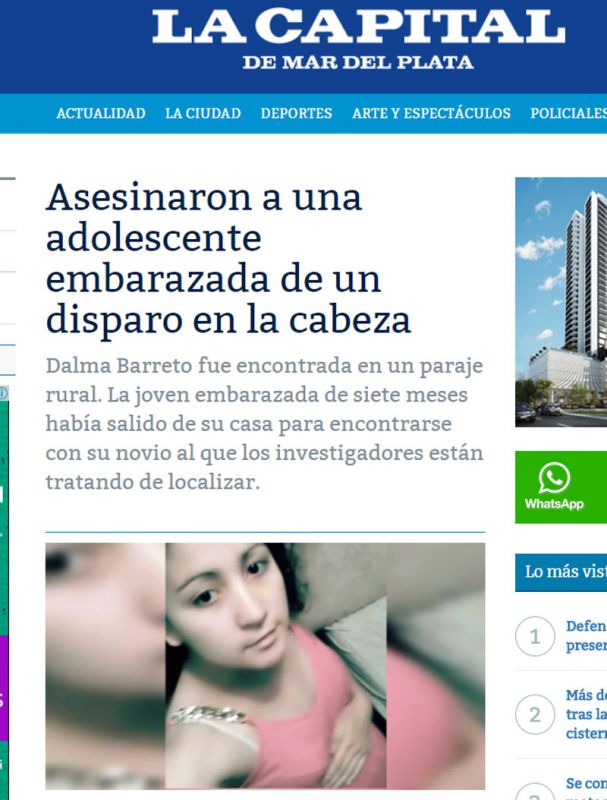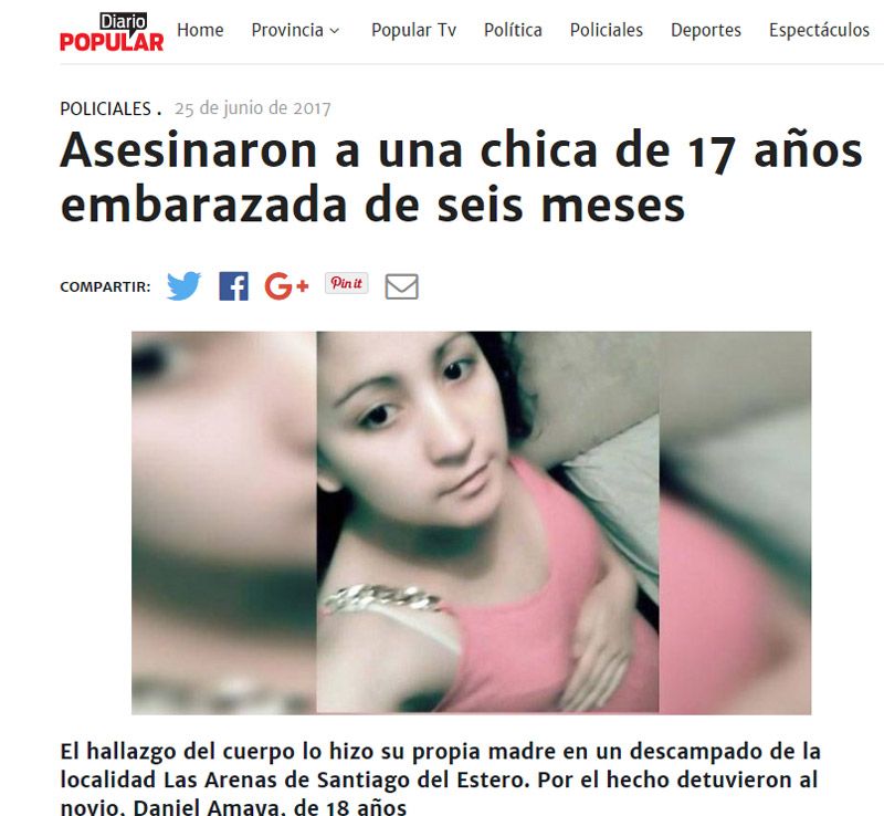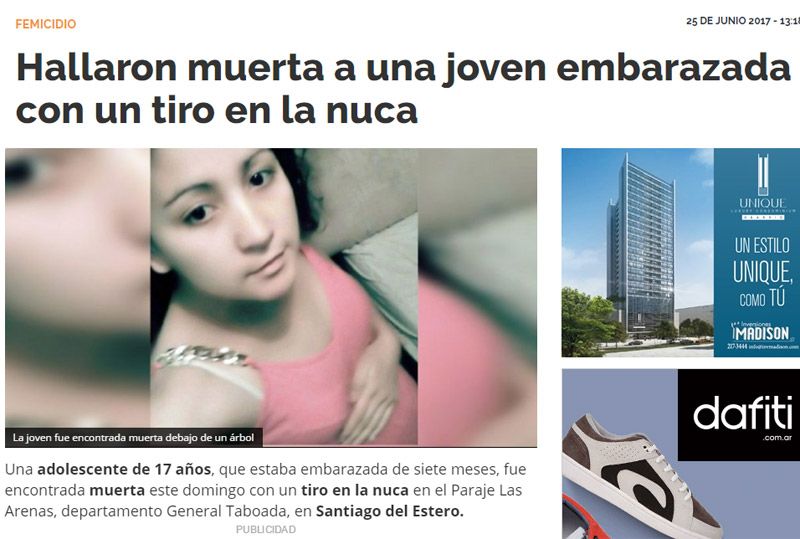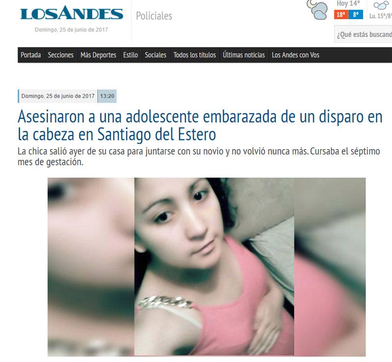 "Asesinaron a una adolescente embarazada de un disparo en la cabeza", tituló La Capital de Mar del Plata. "El hallazgo del cuerpo lo hizo su propia madre en un descampado; por el hecho detuvieron al novio", reflejó Diario Popular, entre otros.