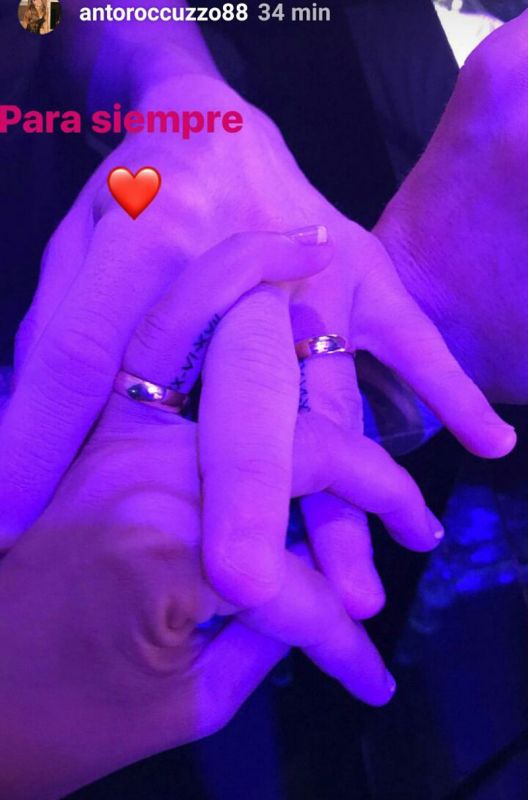 En la foto se pueden ver las manos entrelazadas del crack rosarino y Antonela con las alianzas puestas y la fecha de casamiento en números romanos tatuada en los dedos anulares: "XXX-VI-XVII por 30-6-17".