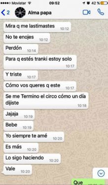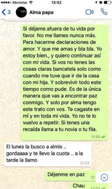 Sin embargo, y aún en medio del conflicto legal que mantiene con Valeria Aquino, el cantante le envió mensajes amorosos a la madre de su hija. Allí no solo le declara su amor sino que además le asegura que "se le terminó el circo". Leé los chats completos, acá.