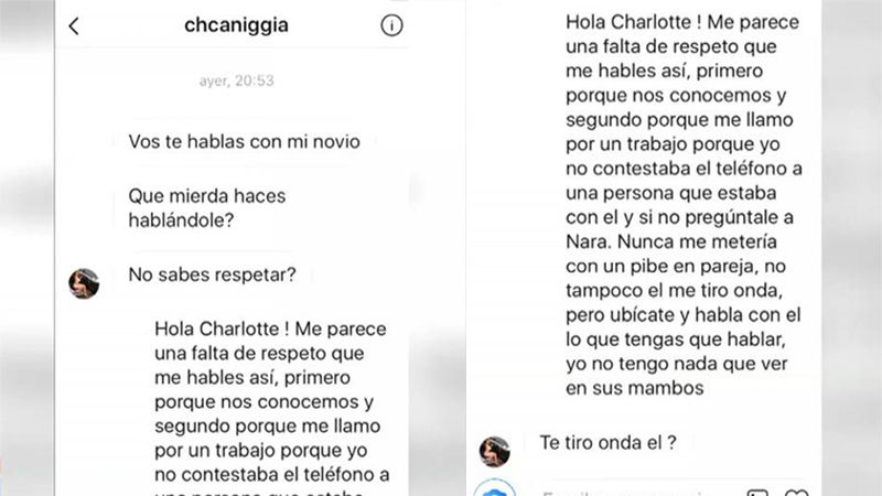 Presa de los celos, Charlotte se puso en contacto con la bailarina de Showmatch, a quien le dedicó fuertes mensajes. En Nosotros a la mañana, pusieron al aire las capturas del chat: “Vos te hablás con mi novio ¿Qué mierda hacés hablándole?”, increpa Charlotte a Rocío.