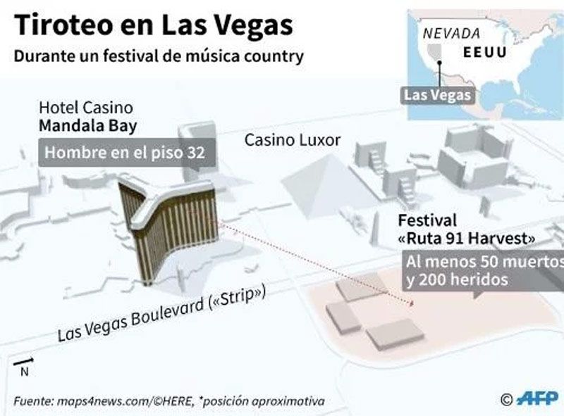 El hotel está ubicado en las cercanías de The Trip, el predio donde se desarrollaba el show. El complejo turístico es resort y casino y es uno de los más llamativos en la ciudad por su fachada dorada. En la habitación donde estaba el agresor encontraron al menos 10 armas de fuego. El atacante se suicidó al verse acorralado por un comando de los grupos de élite de la policía (SWAT).
