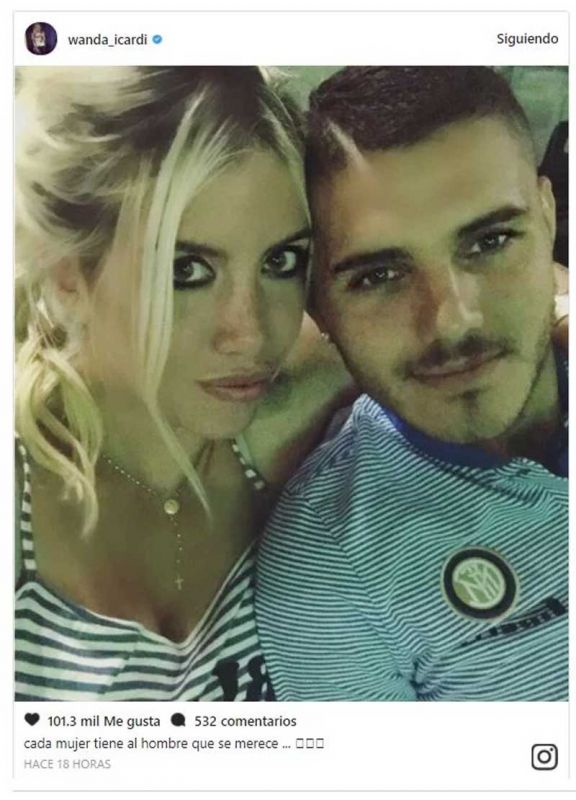 Pero en un intento de frenar la versión que circuló en todos los portales en loas últimas semanas, Wanda mostró una foto junto a su marido, acompañada de una sugerente frase ¿con dedicatoria?: "Cada mujer tiene al hombre que se merece" escribió, despejando las dudas y dejando en evidencia que todo marcha viendo en popa entre ellos dos.