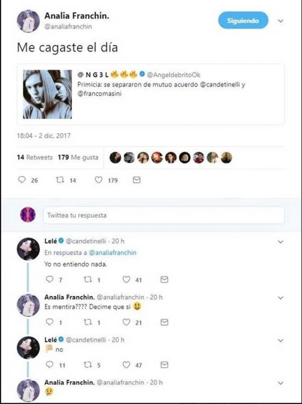 "¿Es mentira? Decime que sí", le consultó Franchín a la hija mayor de Marcelo Tinelli, citando el tweet de De Brito en el que anunciaba el final. "No", le contestó la joven junto a un emoticón de una mano con el dedo pulgar hacia abajo.