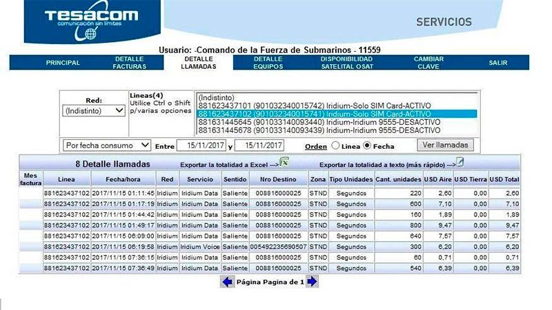 El teléfono satelital del ARA San Juan hizo 8 llamadas salientes durante la madrugada del miércoles 15 de noviembre. Fue en coincidencia con el instante en que se trataban de reparar las baterías.