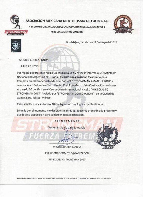 El certamen se llevará a cabo del 2 al 4 de marzo del 2018 en Ohio, Estados Unidos, es el máximo evento de la fuerza mundial , el Arnold Strongman World y solo tres sudamericanos están clasificados, entre ellos, el Negro Pons, único en la historia de nuestro país.