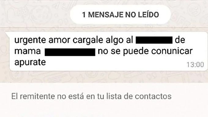 "Urgente, amor". De esta manera comienza un mensaje que comenzó a viralizarse por WhatsApp, donde se le pide a quien lo reciba que cargue crédito a un determinado número porque "mamá no se puede comunicar". Y termina con un contundente "apurate".