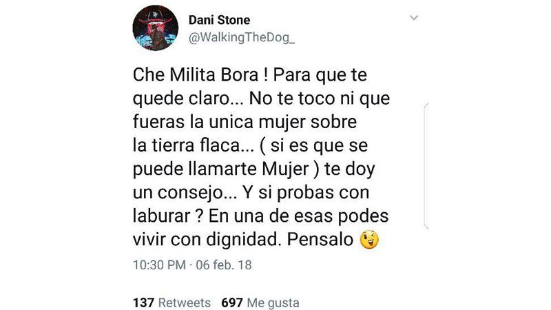 Sin embargo, Osvaldo salió con los tapones de punta contra Militta en Twitter, bajo la implícita suposición de que fue la rubia quien habría filtrado la información. Así, Daniel fustigó: "¡Che Militta Bora! Para que te quede claro… No te toco ni que fueras la única mujer sobre la tierra flaca… (si es que se puede llamarte Mujer) Te doy un consejo… ¿Y si probas con laburar? En una de esas, podés vivir con dignidad. Pensalo".