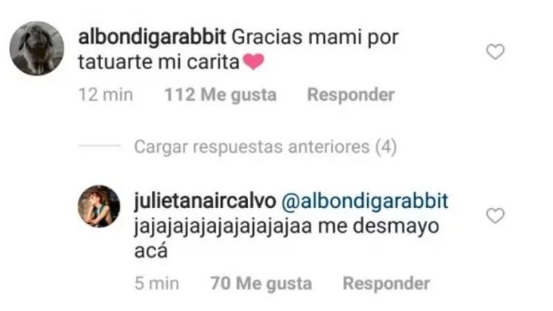 Julieta compartió el tattoo en las redes sociales y escribió en Instagram que es "para siempre. Gracias @iristattooart por toda su humanidad. ¡¡¡Son encantadores!!! Y gracias Sku por darle vida en mi piel al hermoso Albon (no me dolió absolutamente nada y se lo adjudico al artista quilmeño".