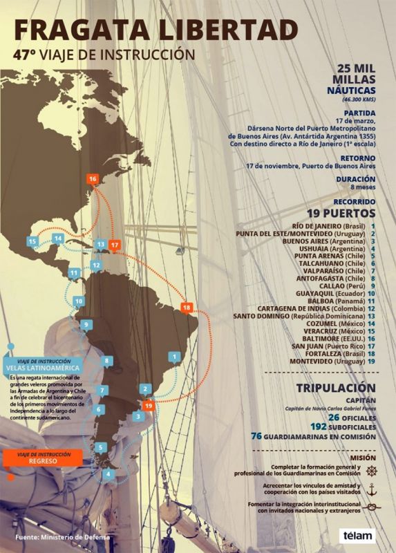 El buque escuela, que estará al mando del capitán de navío Carlos Gabriel Funes, realizará un viaje de unos ocho meses durante los cuales navegará unas 25.000 millas náuticas -que equivalen a 46.300 kilómetros-, y tiene previsto regresar al puerto de Buenos Aires el 17 de noviembre próximo.