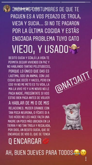 Varias horas después, la dura respuesta llegó de la mano de la hija del conductor de Intrusos: “Jajaja las costumbres de que te paguen es a vos pedazo de trola, vieja y sucia… si no te pagaron por la última cogida y estás enojada problema tuyo gato viejo y usado”, escribió Morena en su Instagram Stories.