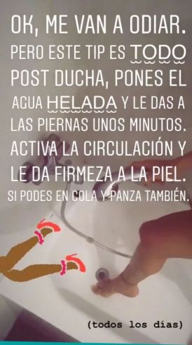 "Ok, me van a odiar pero este tip es todo. Post ducha, ponés el agua helada y le das a las piernas unos minutos. Activa la circulación y le da firmeza a la piel. Si podés, en cola y panza también (todos los días)", escribió la expareja de Juan Martín del Potro (29), junto a una grabación en la que se la ve mostrando el paso a paso de su técnica.