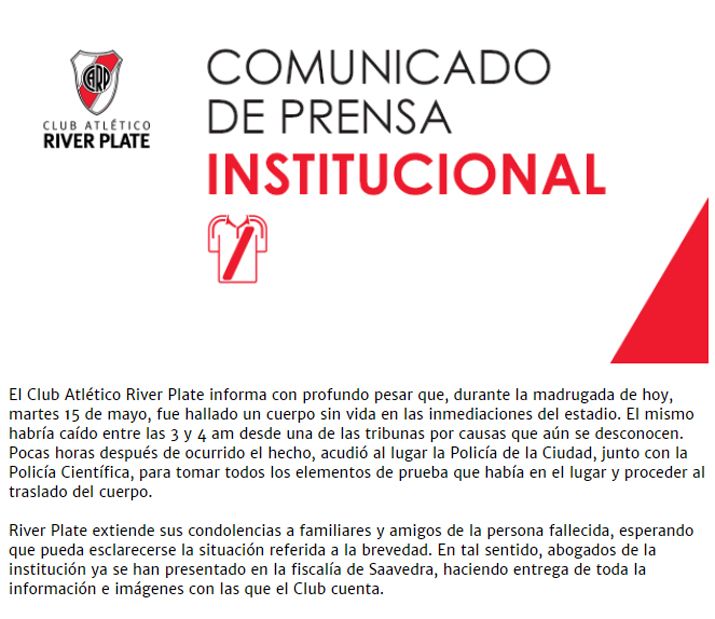 Desde el Millonario emitieron un comunicado, tratando de explicar la situación. "Durante la madrugada del martes 15 de mayo, fue hallado un cuerpo sin vida en las inmediaciones del estadio", señalaron en el mismo y agregaron: "El mismo habría caído entre las 3 y 4 am desde una de las tribunas por causas que aún se desconocen".
