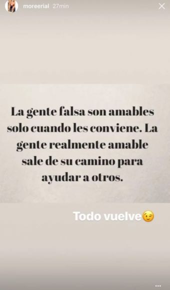 En medio del descargo de Rial en Intrusos, a las 13:13 horas, Morena publicó una frase en Instagram Stories, el mismo lugar donde había publicado la catarata de mensajes contra su padre. "La gente falsa son amables solo cuando les conviene. La gente realmente amable sale de su camino para ayudar a otros", es el texto que pegó en su publicación.