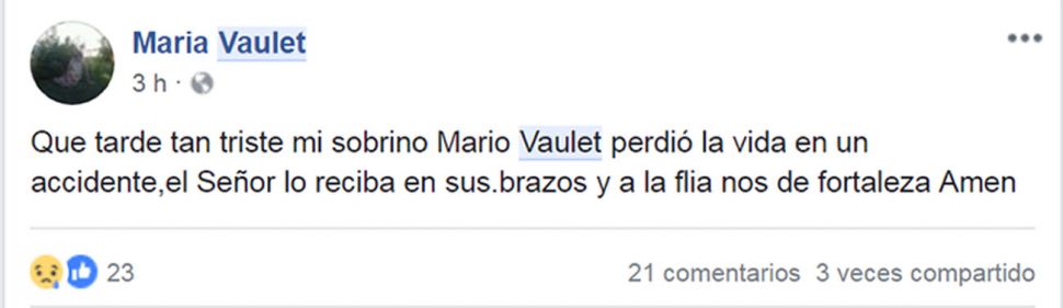 Familiares y amigos de Mario Vaulet expresaron su dolor en las redes sociales una vez que se enteraron de su muerte a raíz de un accidente de tránsito ocurrido este sábado a la tarde en La Banda.