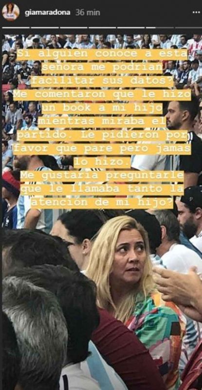 “Si alguien conoce a esta señora, ¿me podrían facilitar sus datos? Me comentaron que le hizo un book a mi hijo mientras miraba el partido. Le pidieron por favor que pare pero jamás lo hizo”, escribió Gianinna en sus historias de Instagram, donde mostró a una mujer rubia que, según le informaron, no paró de fotografiar a Benjamín aun sin el permiso de los familiares que lo acompañaban.