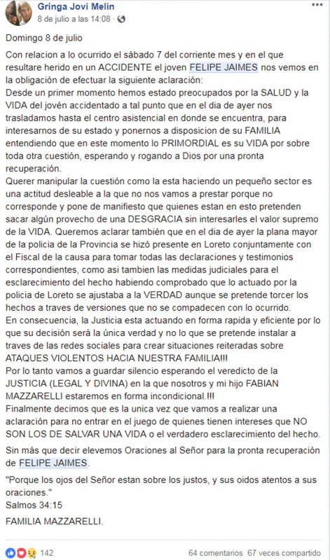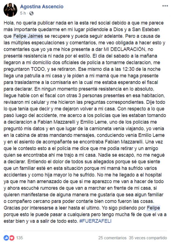 Agostina Ascencio y la familia de Fabián Mazzarelli -ambos iban de acompañantes en la camioneta que conducía Leme y chocó a Felipe- eligieron la red social Facebook para realizar un descargo sobre el dramático hecho, lo que generó todo tipo de comentarios tanto a favor como en contra.