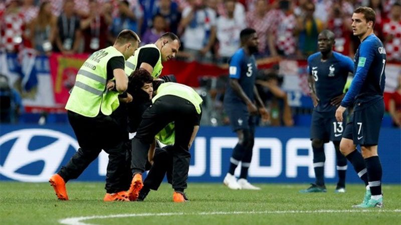 En ese mismo momento, tres hombres ingresaron al campo de juego y corrieron a saludar a los jugadores de Croacia, perseguidos por los hombres de seguridad de chaleco flúo. Fue lo único que se pudo observar en el medio de la transmisión porque la FIFA no quiere visualizar este tipo de situaciones. Uno de ellos fue empujado por Marcelo Brozovicć. El árbitro argentino, Néstor Pitana, detuvo el partido por espacio de 60 segundos, hasta que los guardias retiraron a los invasores y todo volvió a la normalidad.