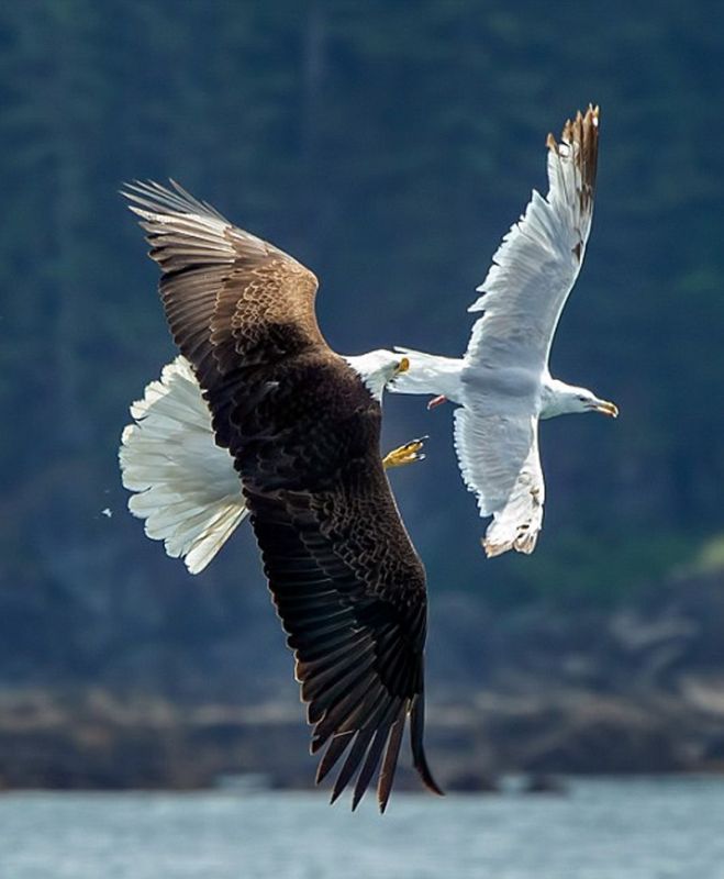 Un águila hambrienta tendió una emboscada a una gaviota desafortunada cuando menos lo esperaba mientras se dirigía al agua para pescar arenque.