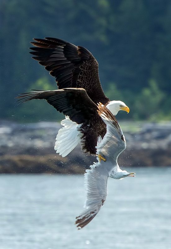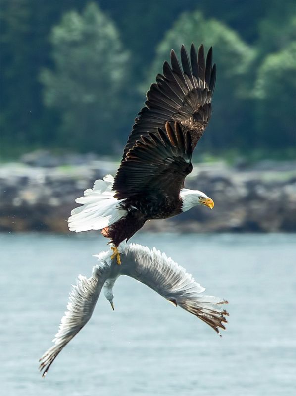 "El águila agarró la gaviota otra vez y comenzó a llevarla de regreso a la orilla. Dejó la gaviota en el agua tres veces más antes de llevarla a los árboles, muy probablemente a un nido con polluelos jóvenes".