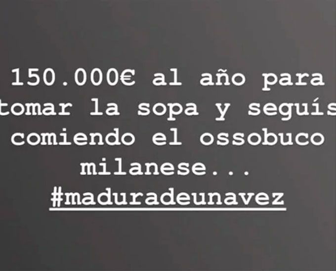 Sin embargo, a Maxi López si le resultó problemática la contestación de su ex mujer. Y decidió dejar un mensaje en su propia cuenta de Instagram. Sin nombrar a Wanda, dejando además una crítica sutil hacia su ex amigo, escribió: "150.000 euros (unos 4.8 millones de pesos) al año para tomar la sopa y seguís comiendo el ossobuco milanese…". Y concluyó con una frase, a modo de hashtag: "Madurá de una vez".