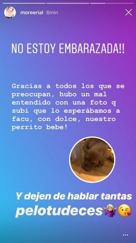 "¡No estoy embarazada! Gracias a todos los que se preocupan, hubo un mal entendido con una foto que subí que lo esperábamos a Facu con Dolce, nuestro perrito bebé", escribió.