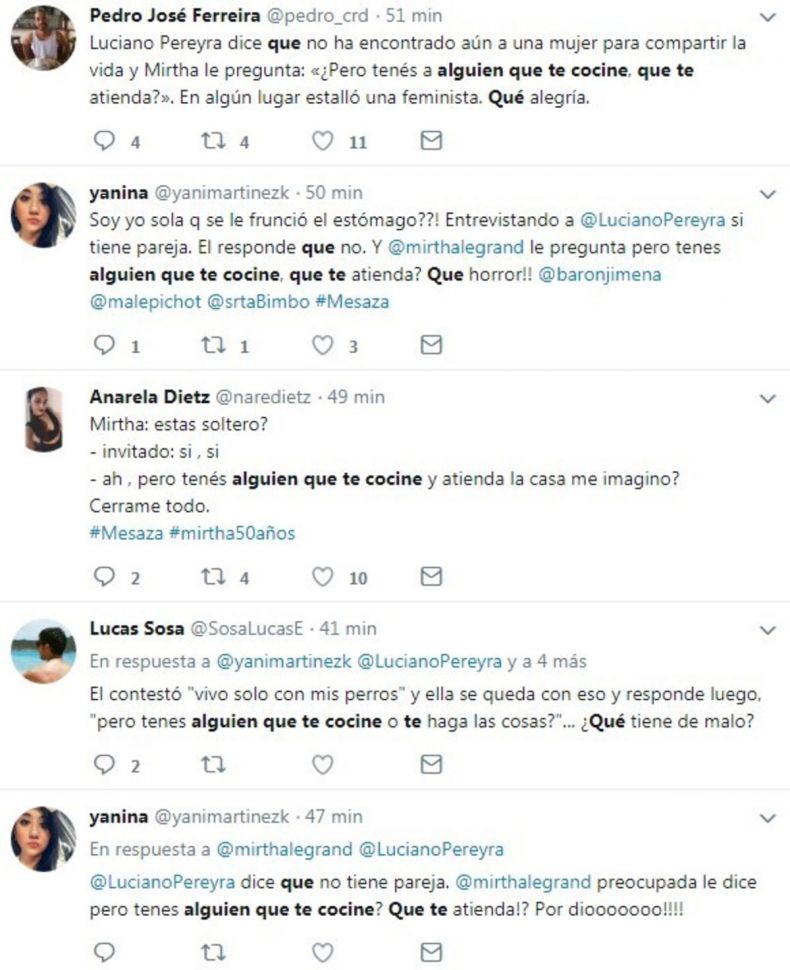Pero en las redes sí no lo dejaron pasar. "¿Soy yo sola que se le frunció el estómago? Entrevistando a @LucianoPereyra si tiene pareja, él responde que no y @mirthalegrand le pregunta: ¿Pero tenés a alguien que te cocine, que te atienda? ¡Qué horror!", publicó una usuaria.