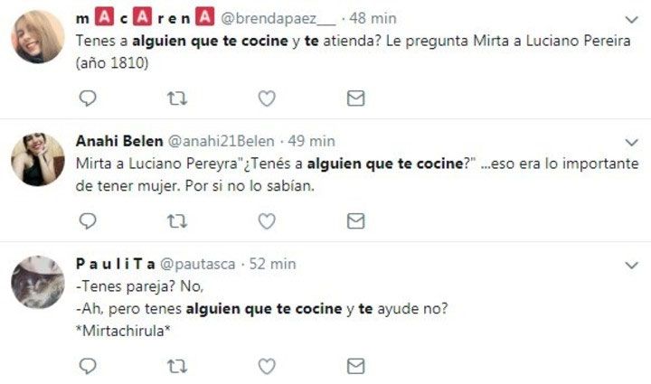 "¿Tenés a alguien que te cocine y te atienda? Le pregunta Mirtha a Luciano Pereyra (año 1810)", aseguró otra mujer y los comentarios de indignación se sucedieron: "Mirtha a Luciano Pereyra"¿Tenés a alguien que te cocine?". Eso era lo importante de tener mujer. Por si no lo sabían". Incluso, una usuaria llamó a la conductora "Mirthachirula".