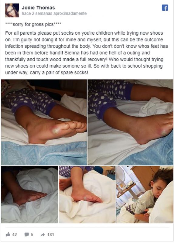 "A todos los padres, por favor, pónganles calcetines a sus hijos cuando vayan a probarse zapatos nuevos", escribió la mujer. "Soy culpable de no haberlo hecho con la mía, y la infección pudo habérsele extendido por todo el cuerpo. No se sabe quién puso el pie ahí antes".