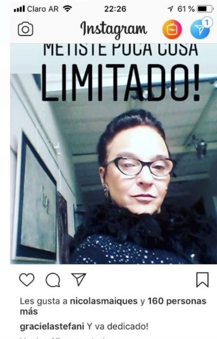 “¡No sabés con quién te metiste, poca cosa, limitado!”, escribió sobre una selfie de su personaje en la obra Sálvense Los Huérfanos. A la publicación agregó: “¡Y va dedicado!”, agregó debajo de la foto como comentario.