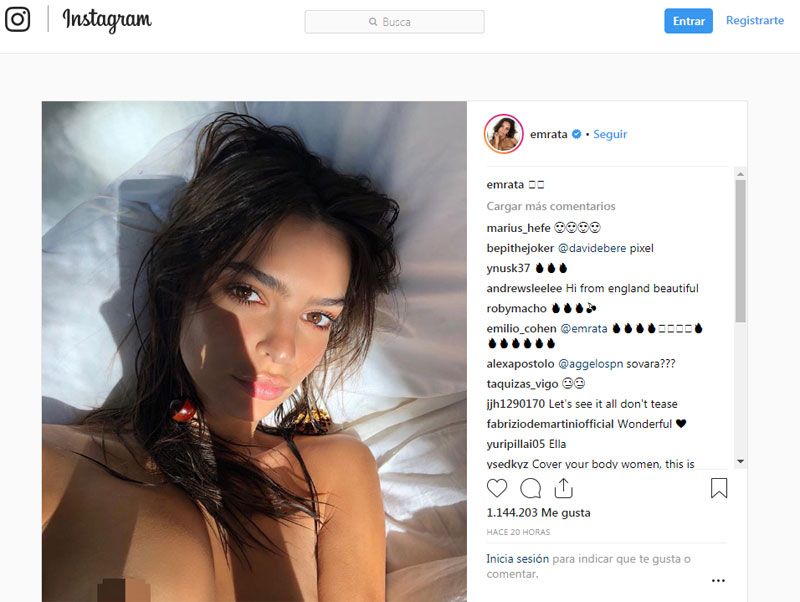 Para evitar ser sancionada por violar las reglas de la red social que no permiten desnudos o contenido explícito, Ratajkowski pixeló su pezón antes de publicar la imagen.