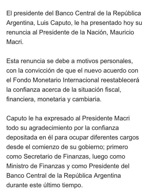 "Caputo le ha expresado al presidente Macri todo su agradecimiento por la confianza depositada en él para ocupar diferentes cargos desde el comienzo de su gobierno; primero como Secretario de Finanzas, luego como Ministro de Finanzas y como Presidente del Banco Central de la República Argentina durante este último tiempo", agregó el comunicado difundido por el Banco Central.