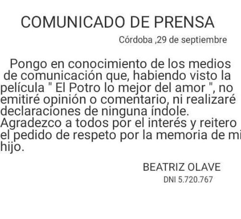 "Habiendo visto la película El Potro, lo mejor del amor, no emitiré opinión o comentario, ni realizaré declaraciones de ninguna índole. Agradezco a todos por el interés y reitero el pedido de respeto por la memoria de mi hijo", expresó Beatriz a través de un comunicado de prensa que publicó Ulises en su cuenta de Instagram.