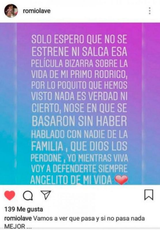 "Solo espero que no se estrene ni salga esa película bizarra sobre la vida de mi primo Rodrigo", comenzó diciendo Romina en una placa de sus historias de Instagram que luego publicó también entre sus fotos.