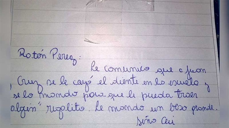 Atenta, la “Seño” Cecilia comprendió la importancia de este hecho para el nene y tuvo una idea brillante: juntó el diente de Juan Cruz y le escribió una carta al mismísimo Ratón Pérez. En ella la docente cuenta lo sucedido y le pide al buen roedor que tenga a bien acercarle un “regalito” al niño.