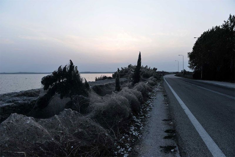 Una gran telaraña ha cubierto 10.000 metros cuadrados de ribera en un pueblo junto al lago Vistonida, en el norte de Grecia, después de que hace un mes un fenómeno similar en otra zona del país se hiciera viral en todo el mundo.