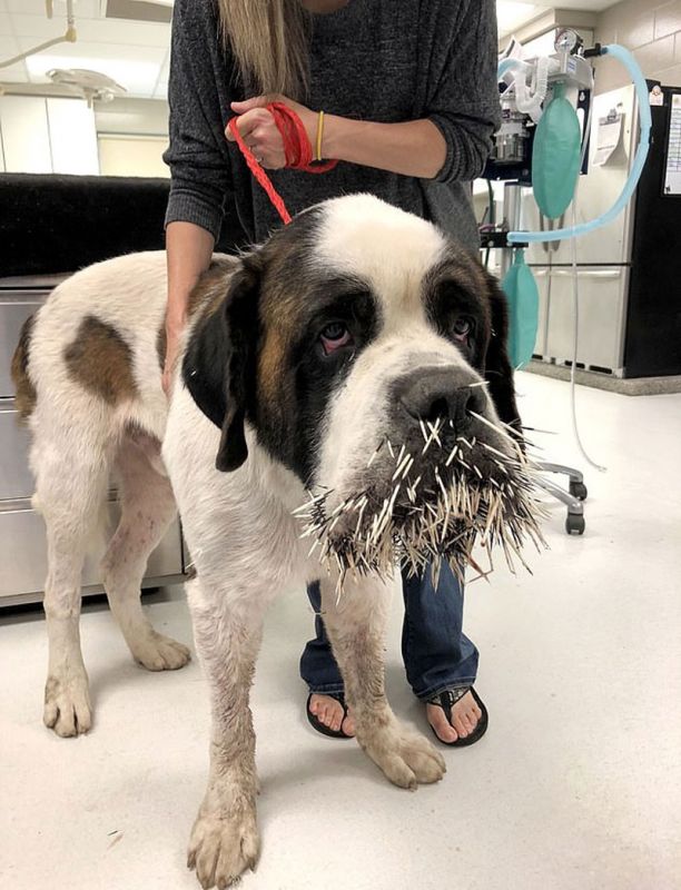 Un desafortunado San Bernardo se quedó con una boca llena de púas, después de un encuentro con un puercoespín, y no fue la primera vez.