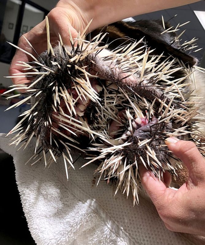 Por suerte para el cachorro, el equipo veterinario fue capaz de eliminar todas las púas, después de que Ruckus se acercó demasiado y activó la capacidad de los puercoespines para "disparar" sus espinas.