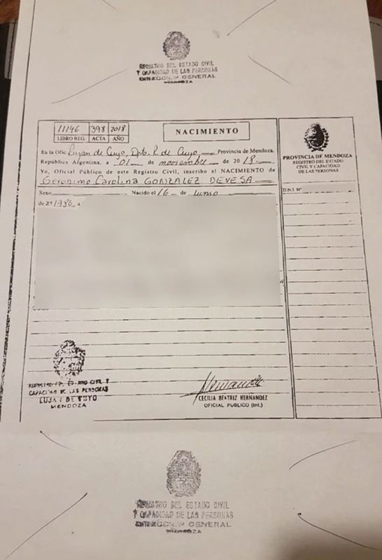 La partida de nacimiento original, del 16 de junio de 1986, dice María Carolina González Devesa. Sexo femenino. Ahora tiene una nueva, con fecha de 1 de noviembre de 2018. Dice Gerónimo Carolina González Devesa.