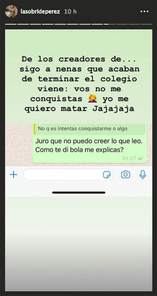 "De los creadores de 'sigo a nenas que acaban de terminar el colegio' viene: 'no me conquistás'. Yo me quiero matar", escribió Sol Pérez al lado de la primera captura del chat donde el muchacho le reclamó: "No es que vos intentás conquistarme o algo". La respuesta de ella fue contundente: "Juro que no puedo creer lo que leo. ¿Cómo te di bola? ¿Me explicás?".