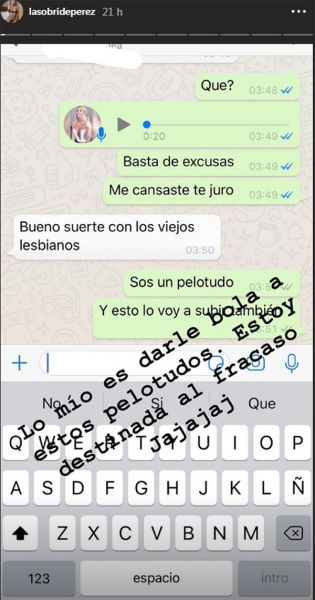 Indignado, él le retrucó: "Bueno, suerte con los viejos lesbianos". Lejos de dar por terminada la pelea virtual, la ex "chica del clima" se despachó con el siguiente texto: "Sos un pelotudo. Y esto lo voy a subir también".