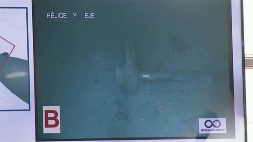 Al pasar a la impresión B, detalló que se trata del cono de popa, la hélice y el eje. "El submarino tiene una sola hélice y siete palas. Aparentemente habría dos enterradas en el fondo y las otras cinco visiblemente afuera", dijo durante su exposición.