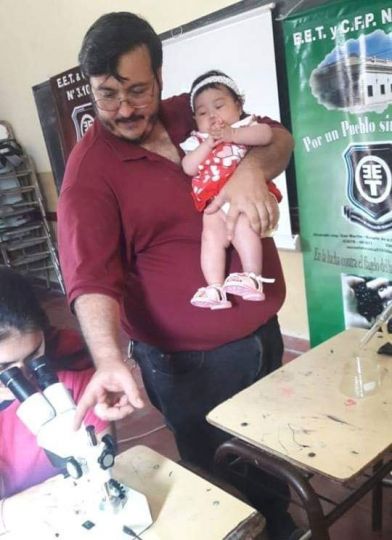 La fotografía de un docente dando clases con la pequeña hija de una de sus alumnas en brazos, se viralizó en el sur provincial. Se trata del ingeniero agrónomo salteño Ernesto Paz Chain (47), ex estudiante de la UNSa, quien dicta clases de en las dos escuelas técnicas de la ciudad de Rosario de la Frontera.