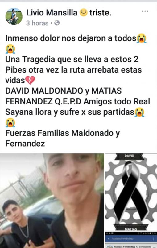 David Antonio Maldonado y Matías Fernández perdieron la vida tras chocar con un caballo en la Ruta 34