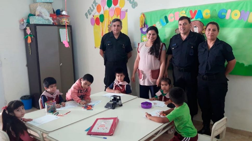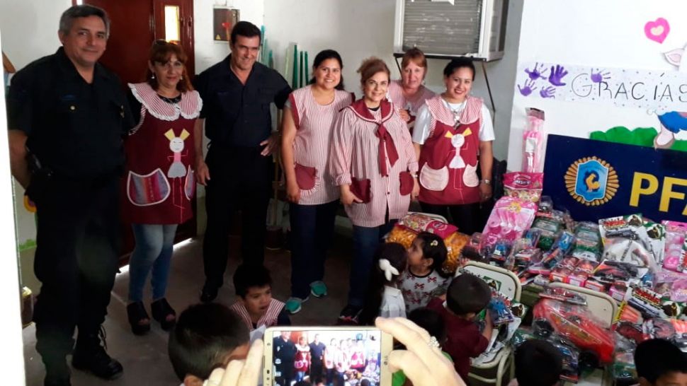 Miembros de la fuerza policial entregaron a directivos de la institución educativa las donaciones y compartieron momentos de juegos y distensión.