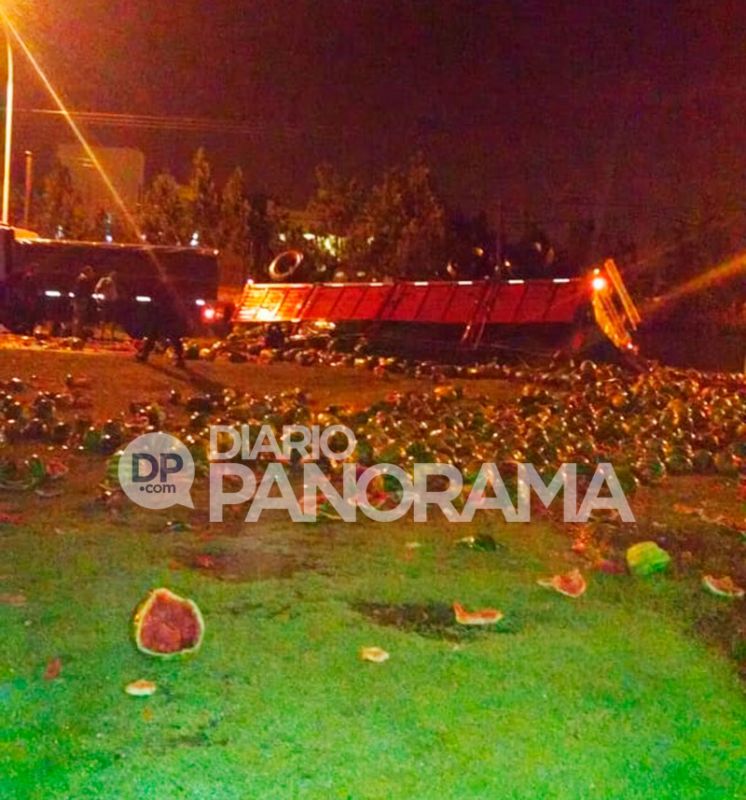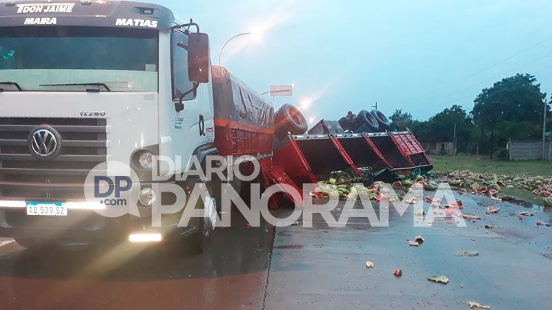 Un camión, cargado con sandías, volcó luego de que su conductor realizara una brusca y peligrosa maniobra. Según explicó a la policía, tuvo que hacerlo para evitar chocar a dos motociclistas que corrían una carrera, y aparecieron de imprevisto. Por fortuna, el camionero resultó ileso.