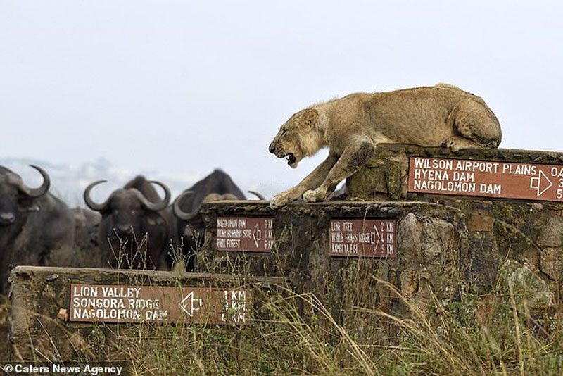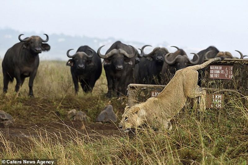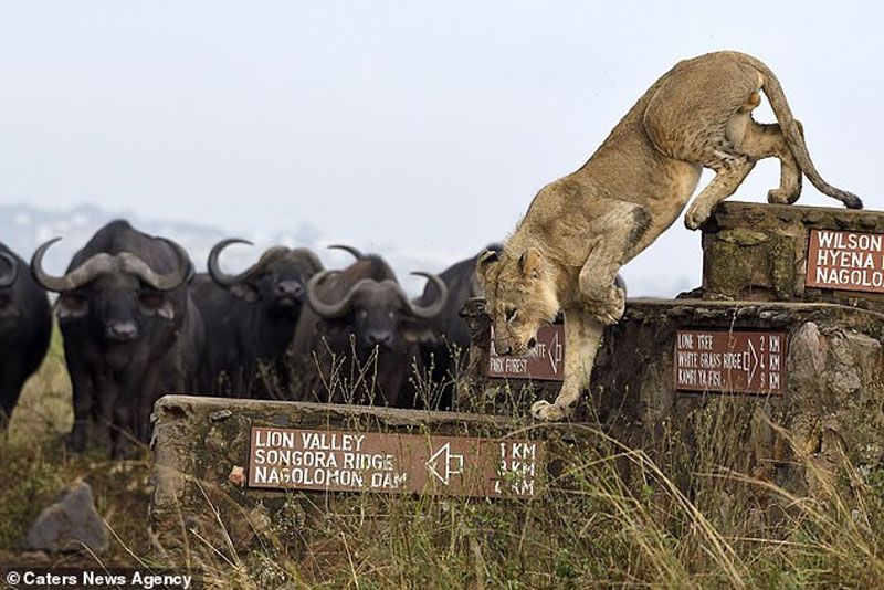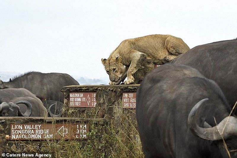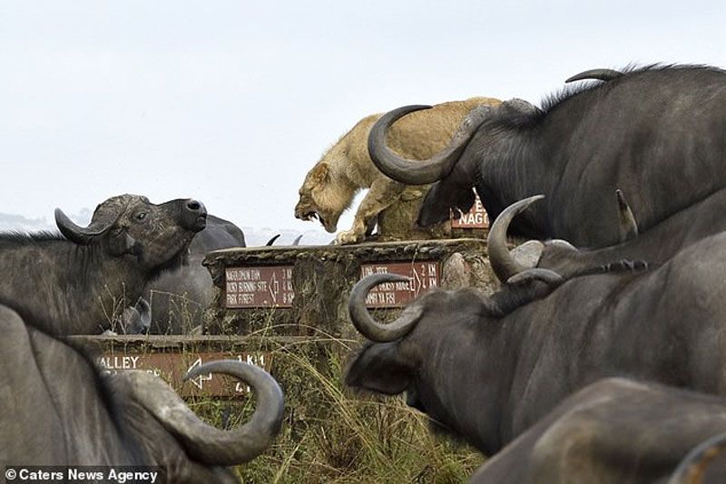 Sheik dijo: “Estaba conduciendo cuando vi una manada de búfalos bloqueando la carretera. Vi a un joven león en la parte superior del poste marcado rodeado de búfalos. Fue mi día de suerte, ya que este es un evento raro. Inmediatamente detuve el auto y comencé a tomar fotos”.