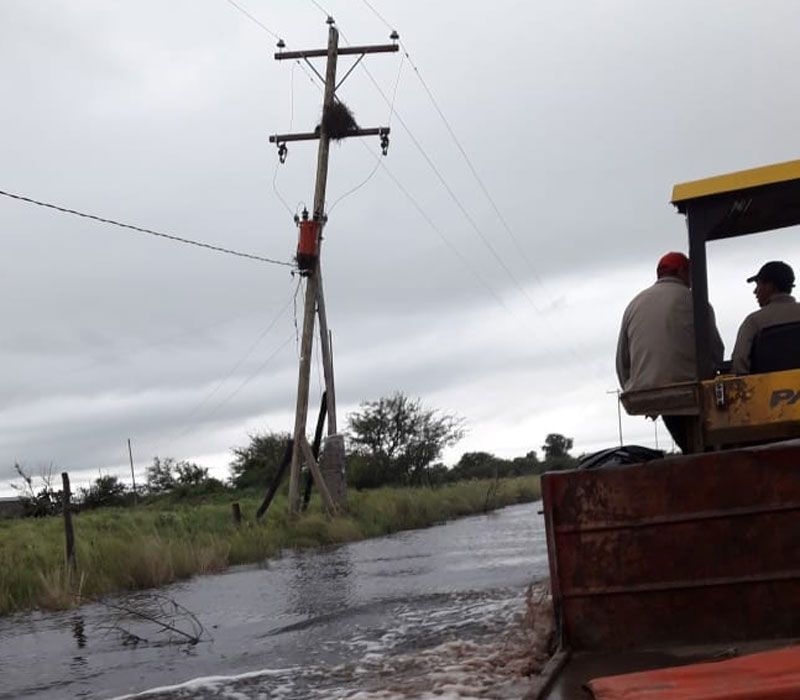 Obreros afectados a la empresa de distribución de energía eléctrica recorren las zonas afectadas por las intensas lluvias, precisamente en la zona de El Cuadrado, ubicado en el límite con Santa Fe, en el departamento Juan Felipe Ibarra del este provincial.