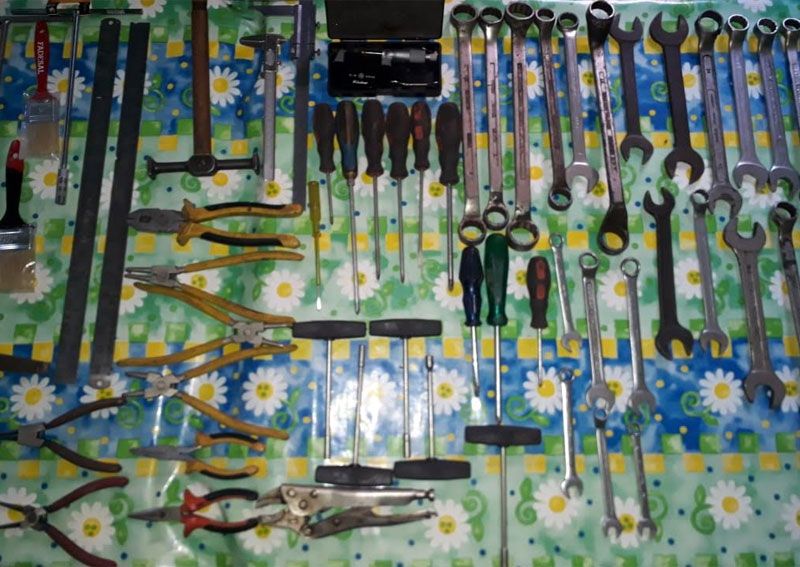 Posteriormente, realizaron un rastrillaje por el lugar y a unos 250 metros del primere hallazgo, aproximadamente, se encontraron con un balde con herramientas y una caja de tubos de color negro, que contenían 26 llaves de diferente diámetro; 8 pinzas; 10 destornilladores (Phillips, planos y busca-polos) 8 llaves en T; 1 martillo; 1 pincel; 10 discos de corte; 1 caja con tubos y 15 puntas de destornilladores, entre otros elementos.